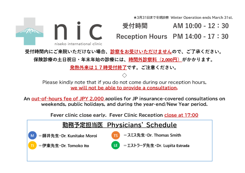 診療情報 2月 27, 2026 🌸3月の診療スケジュール🌸 3月の診療スケジュールのご案内です。冬期スケジュールは3月31日までとなります。4月からは夏期スケジュールに変更となり、診療時間および診療日が異なりますので、ご注意ください。詳細が決まりましたら、改めてお知らせいたします。 Niseko International Clinic 050-1722-5202 ホームページ
