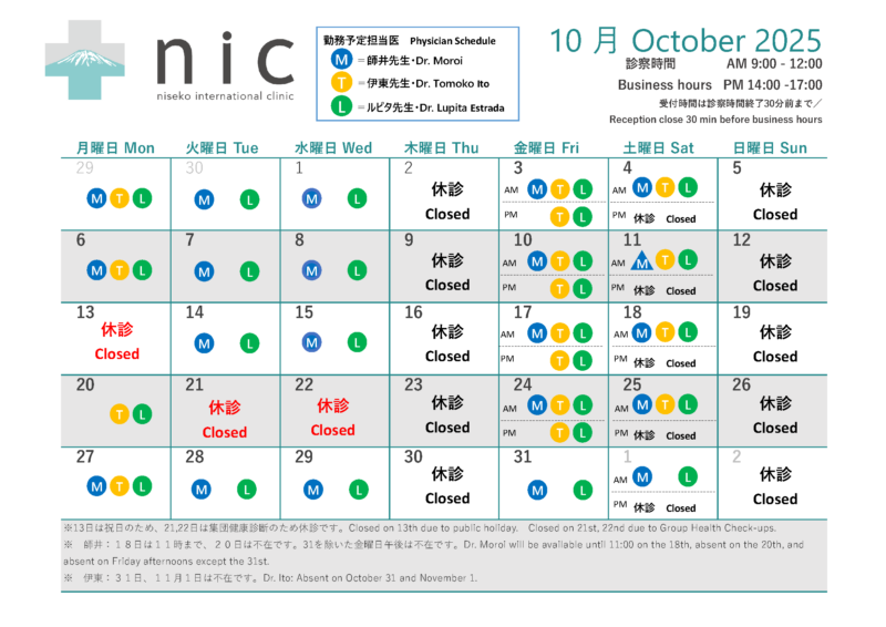 ※ Closed on October 13 (public holiday) and October 21–22 (group health checkups).