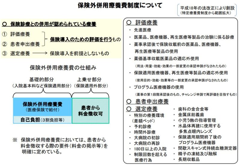 In Japan, under the principle of universal health insurance, essential and appropriate medical care is generally covered by insurance. However, medical services that are not covered by insurance but may eventually be considered for future coverage, such as advanced medical treatments, are allowed to be combined with insurance-covered treatments under the “Co-payment for Non-covered Medical Services” system. This system follows specific rules to ensure safety and efficacy and permits such treatments to be used alongside insurance-covered treatments. The Co-payment for Non-covered Medical Services system is divided into three categories: “Evaluated Treatments,” “Patient-requested Treatments,” and “Selected Treatments.”