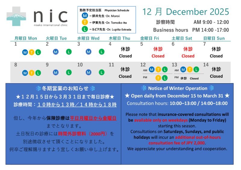 From December 4th (Wed) to 6th (Fri), the clinic will be closed all day due to our annual winter preparation meeting and staff training.